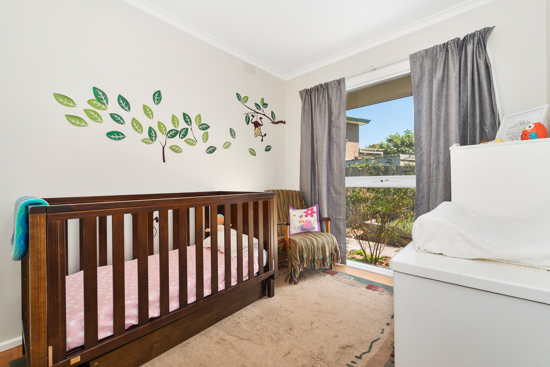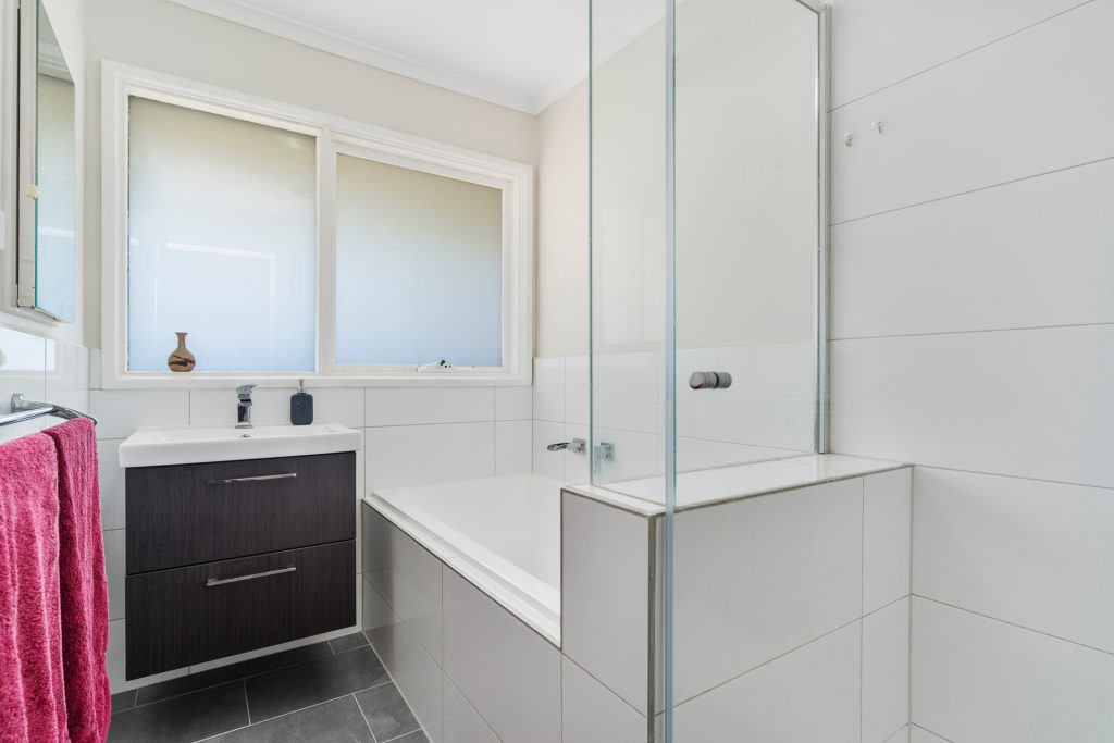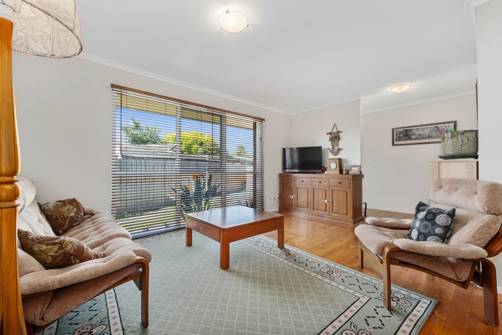 The centrally located bathroom includes both a separate bath and shower, ideal for family living. Floorboards run throughout the home, adding style and easy maintenance, while the surrounding gardens are designed to be low upkeep so you can spend more time enjoying your home.